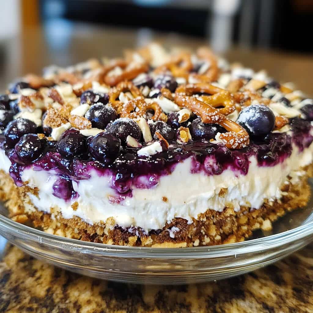 What truly elevates this dish is its balance—each bite offers a medley of contrasts that keeps you coming back for more. The pretzel crust adds just the right amount of savory crispness to offset the sweetness of the blueberry topping, while the creamy filling ties everything together beautifully.