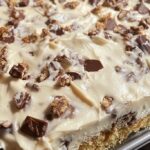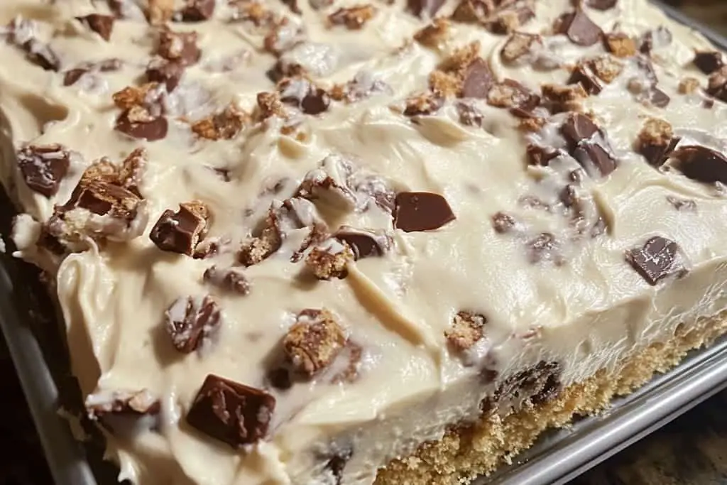 10. Frost the Cake: Once the cake is completely cool, spread the peanut butter frosting evenly over the top. Optionally, melt chocolate chips and drizzle over the frosting for an extra touch.