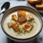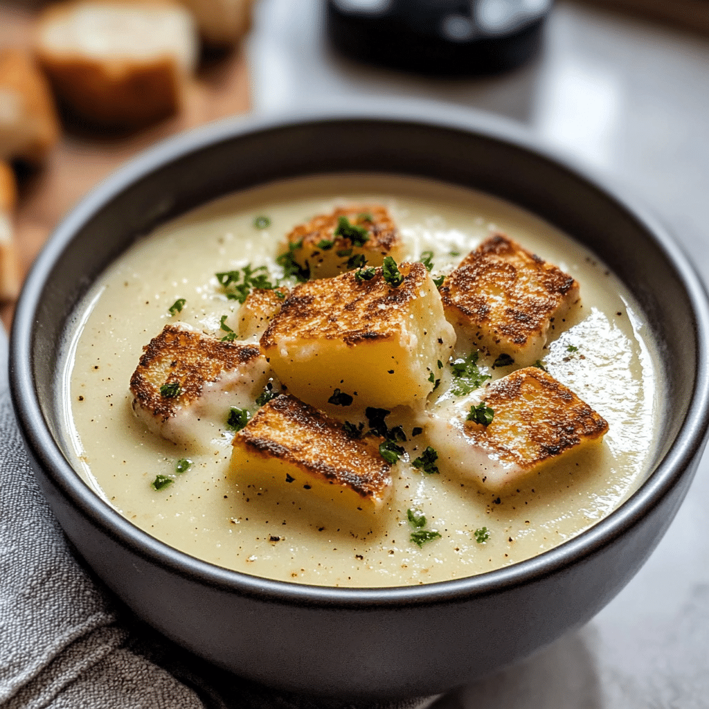 Roasted Garlic Potato Soup with Grilled Cheese Croutons is the ultimate comfort food for cozy evenings. This creamy, velvety potato soup features the rich and aromatic flavors of roasted garlic, perfectly blended with tender potatoes and a smooth broth. Topped with crispy grilled cheese croutons, this soup becomes a hearty, satisfying meal that’s both comforting and indulgent. Whether you’re serving it for a casual family dinner or preparing it for a special occasion, this dish will surely become a favorite. Plus, it’s entirely free of pork and alcoholic beverages, making it suitable for a variety of dietary preferences.