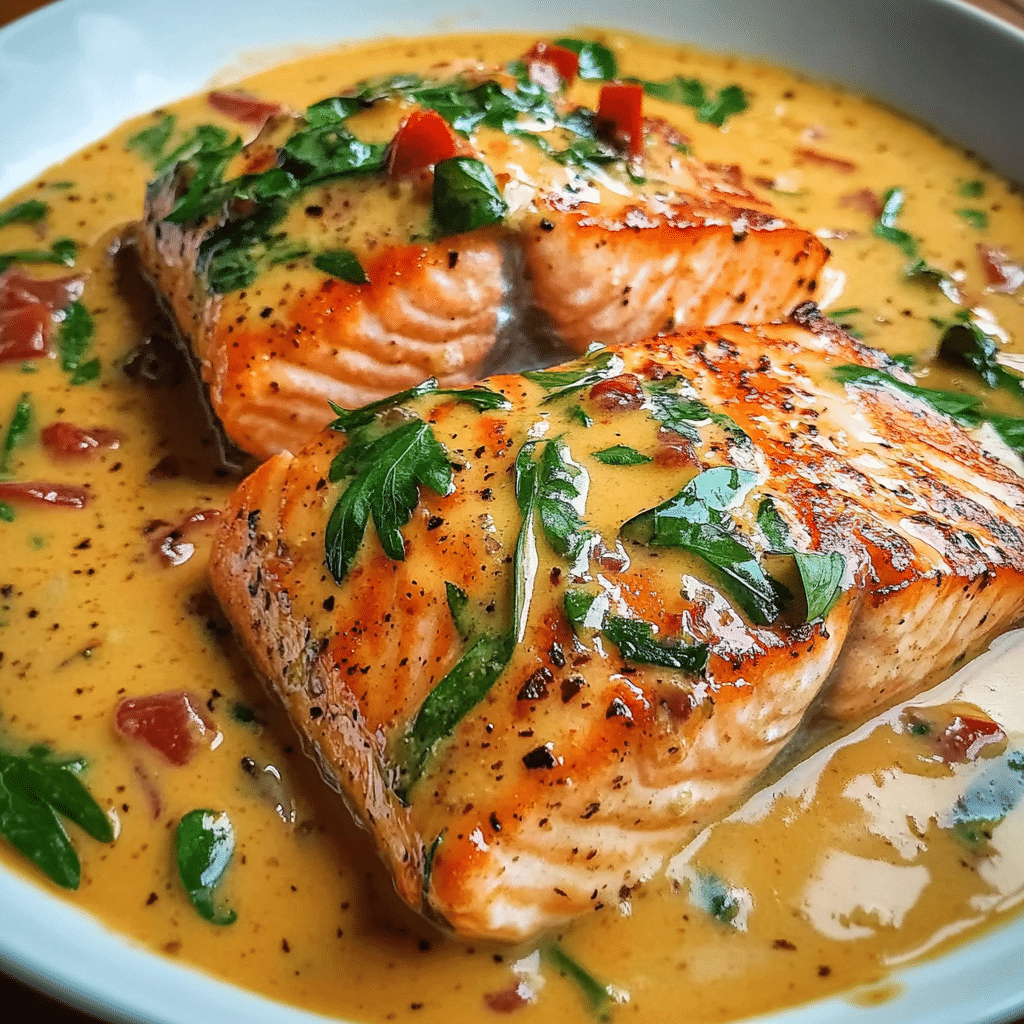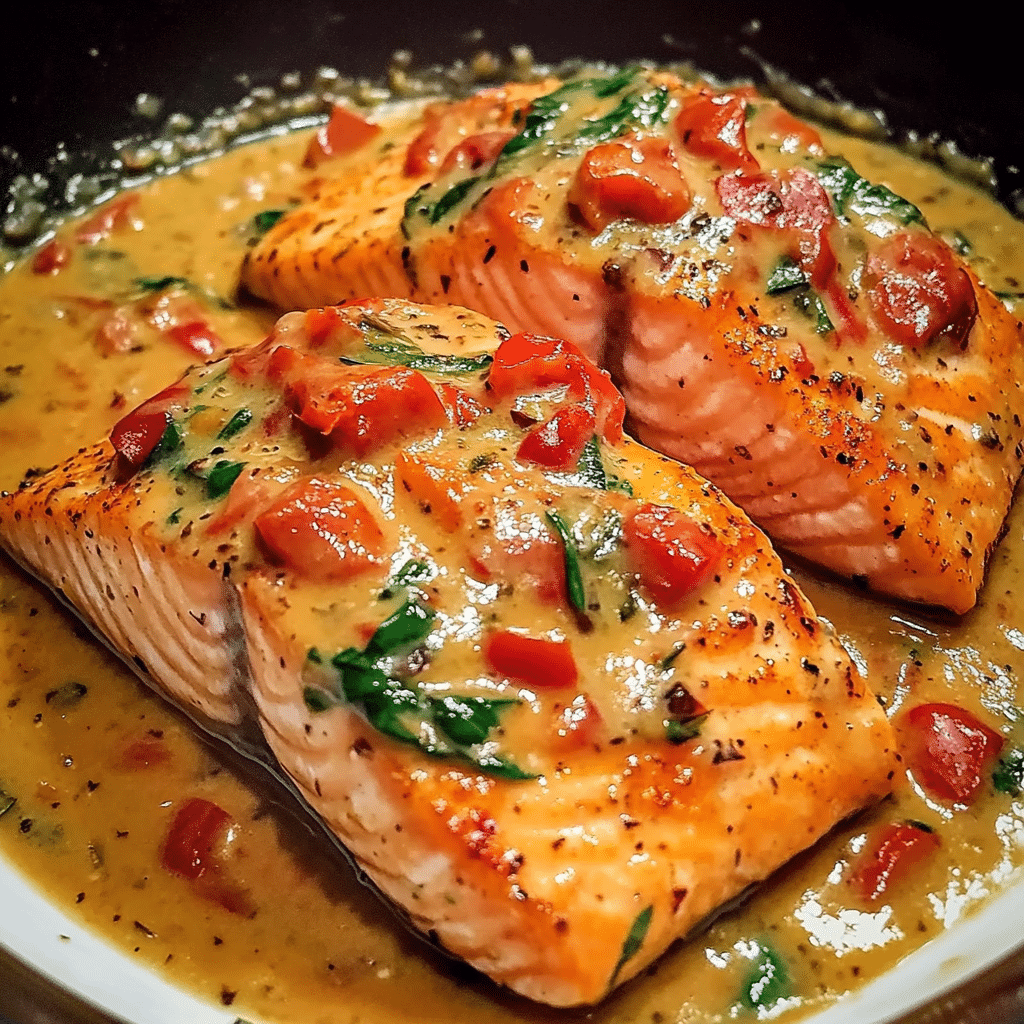 Salmon in Roasted Pepper Sauce is a luxurious and flavorful dish that feels both indulgent and surprisingly simple to prepare. Succulent, pan-seared salmon fillets are bathed in a creamy, roasted red pepper sauce infused with garlic, Parmesan, and a hint of paprika for depth. The result is a restaurant-quality meal with a perfect balance of smoky, savory, and slightly sweet flavors.