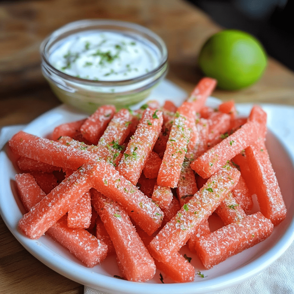 Watermelon Fries with Coconut Lime Dip are not only delicious but also incredibly easy to prepare, making them an ideal choice for those spontaneous summer afternoons. They’re perfect for kids, adults, and anyone looking for a healthier alternative to traditional fries. Whether served as a refreshing appetizer, a healthy dessert, or even a poolside snack, this dish is guaranteed to impress. If you’re looking for a fresh and unique way to enjoy watermelon, this is the recipe you need!